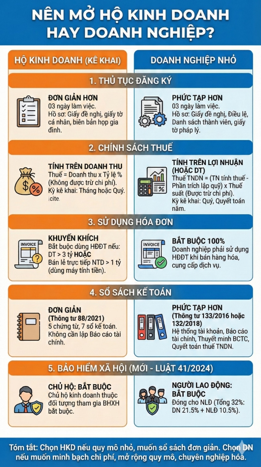 Lời khuyên: Nếu khách hàng của bạn chủ yếu là cá nhân (B2C), hãy chọn Hộ kinh doanh để giảm tải áp lực sổ sách.